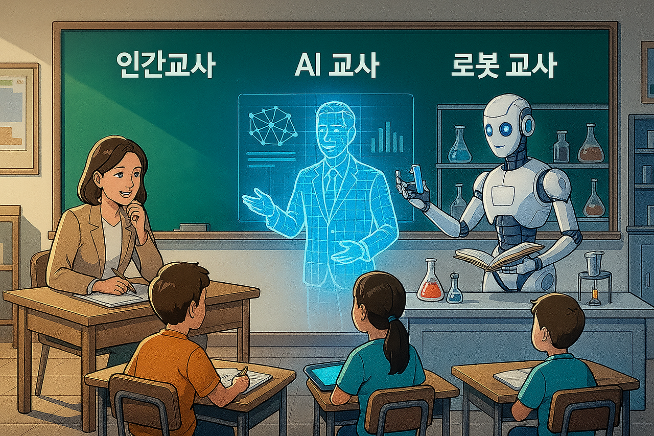 미래의 학교는 더 이상 칠판과 분필의 공간이 아닙니다. 인간 교사는 공감과 동기를 이끌고, 인공지능 교사는 데이터를 통해 맞춤형 학습을 지원하며, 로봇 교사는 실제 체험을 돕습니다. 세 교사가 협력하는 교실에서는 머리로 배우고, 몸으로 이해하며, 마음으로 성장하는 새로운 배움의 시대가 펼쳐지고 있습니다.